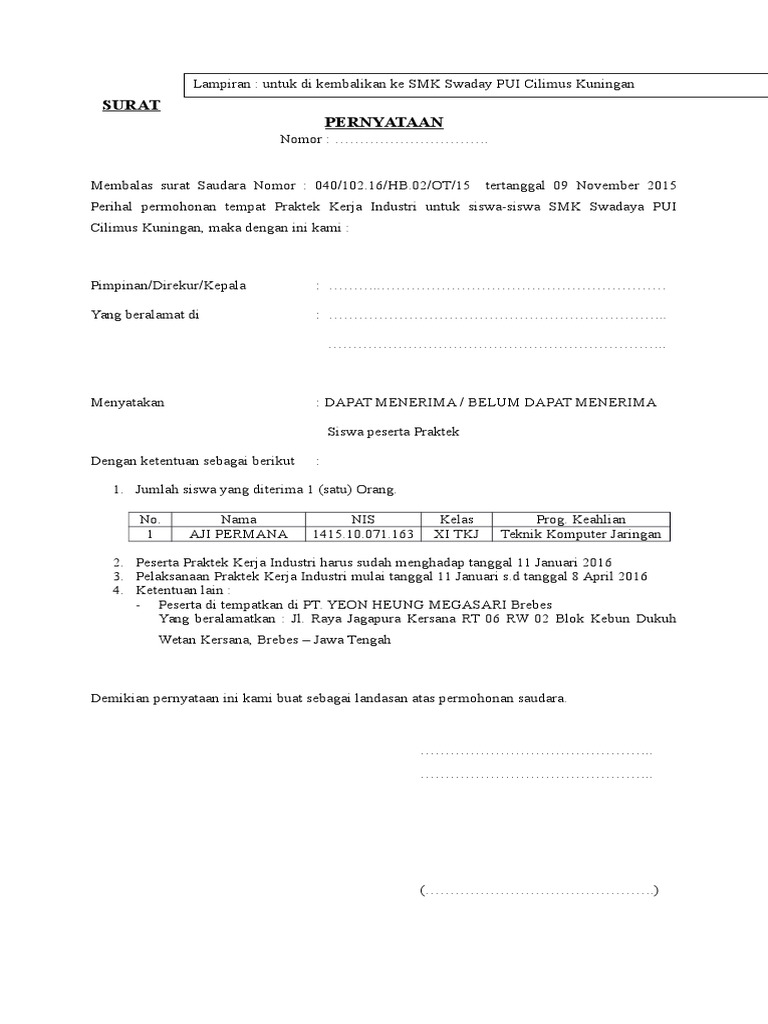 Contoh Surat Balasan Prakerin Cikeri from imgv2-1-f.scribdassets.com Demikian beberapa contoh surat balasan penerimaan pkl untuk berbagai jurusan. 689/un 18.6/dt/2016 yang diajukan kepada kami oleh mahasiswa bapak atas nama : Membaca surat saudara nomor : Contoh surat balasan pkl ini kami buat untuk anda semua supaya anda bisa langsung menggunakan untuk bisa memberikan kepada tempat sekolah mereka sehingga perusahaan bisa menuliskan surat balasan pkl ini untuk bisa langsung memberikan pekerjaan kepada siswa yang sudah melakukan pkl di perusahaan tersebut. Jika ada kesalahan dalam penulisan kata di artikel kami ini, kami mohon maaf. Praktek kerja lapangan bisa diajukan kepada bank minimarket bengkel atau lainnya. The collection that consisting of chosen picture and the best amongst others. Maybe you would like to learn more about one of these?